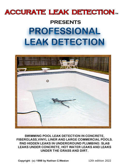 Including: All types of pool leaks: Vinyl liner, fiberglass, concrete, pool+spas and commercial pools. Locating broken underground pipes and repairs Locating slab leaks under buildings and behind walls Lists of the best manufactures and suppliers of equipment- invest $800 -$5000 to start up. Marketing, advertising and sample business forms Self test, phone call sheets and more! 12th Edition for 2022: What's new? * Non destructive internal pipe repair *Updated leak detection instruments featuring the FISHER XLT-30 *Trouble shooting pumps, replacing noisy bearings * Plastic light housings cracks: becoming a leak epidemic * Updated bottom drains, skimmer repairs, spa jet repairs * 6 rules on troubling shooting pools with flex pipes * After 15 years in the making- its The FINAL edition ! |